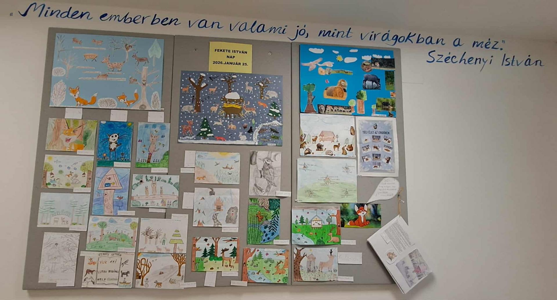 A megemlékezés további részében tanulóink jutalmazása következett, akik négy kategóriában versenyeztek: feladatlapot töltöttek Fekete Istvánról, műveiről; rajzoltak; készítettek tablót vagy makettet a téli erdőről, Fekete István és a zalai erdők állatairól, a vadetetésről. Nagyon sokan szálltak versenybe az alkotás öröméért és a tudás gyarapításáért.
