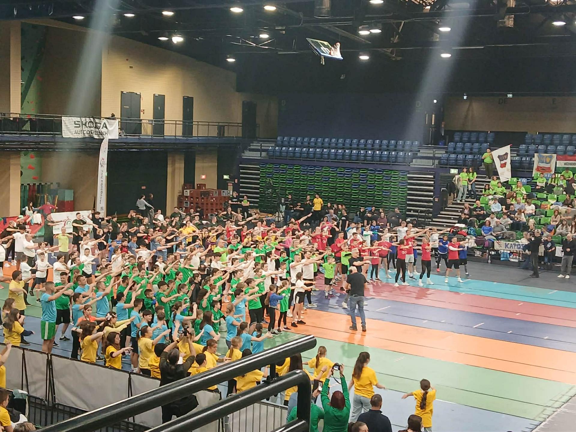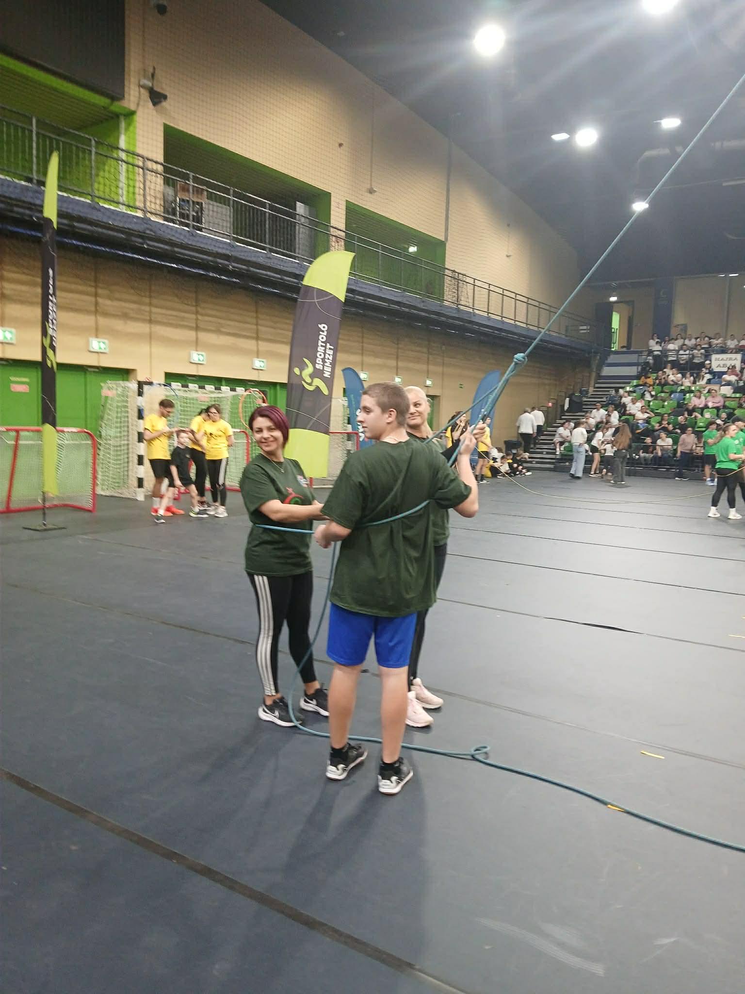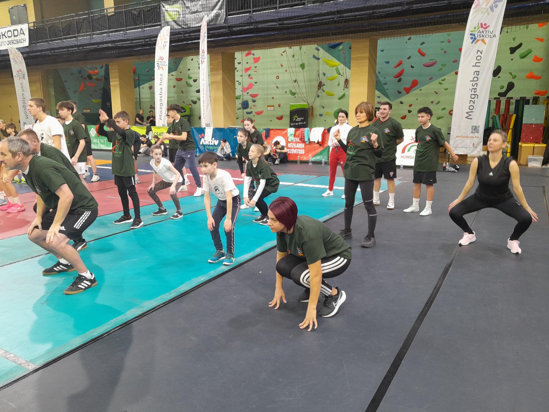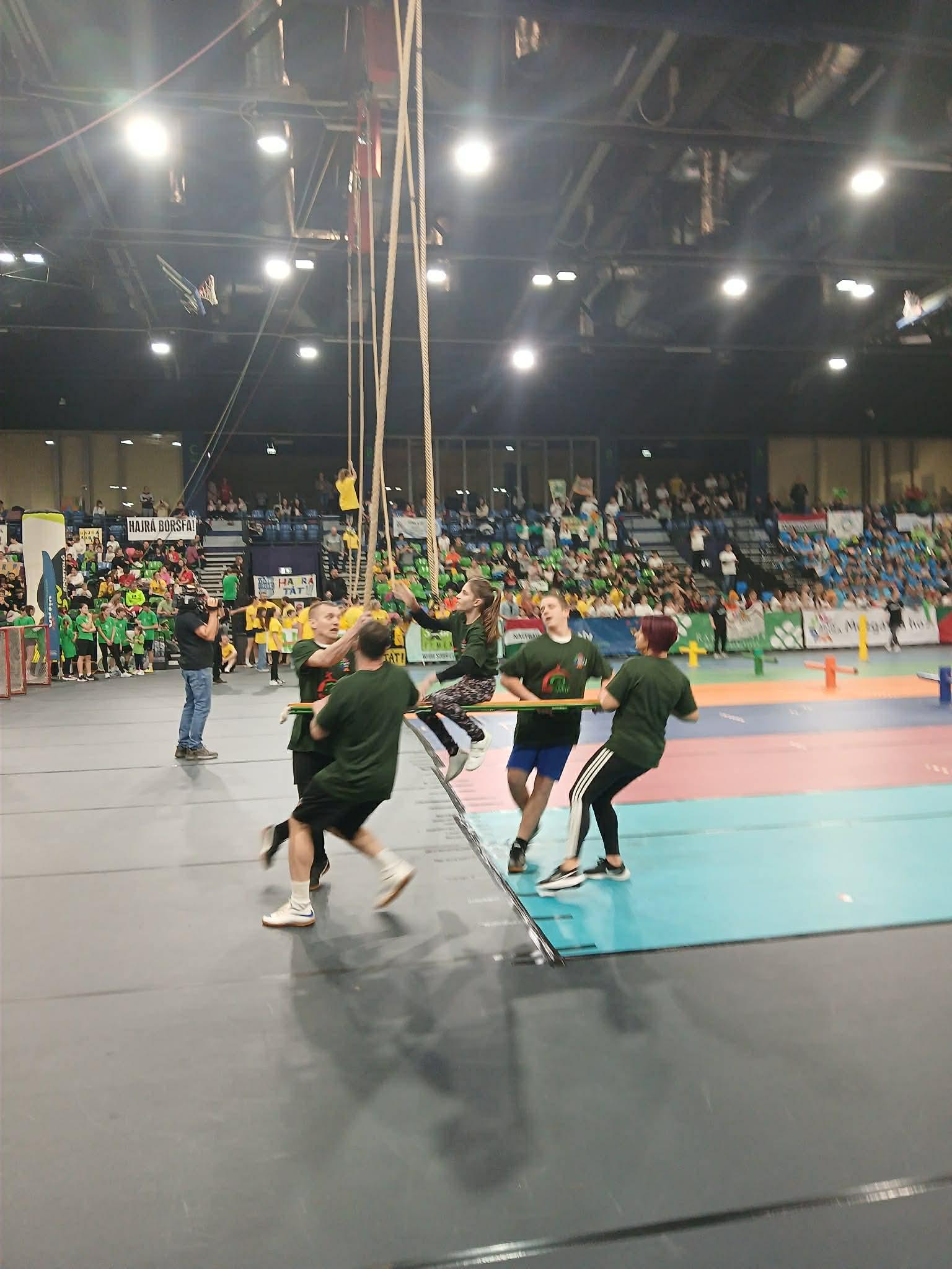 Sportcsarnokban. A csapat igazi közösségi összefogással jött létre: alsós és felsős tanulók,
